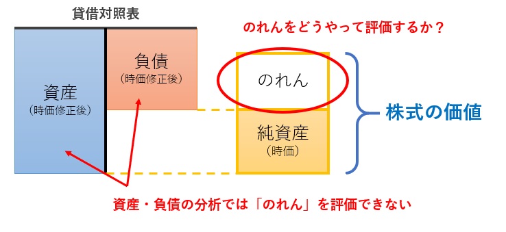 年買法は、「会社の株式の価値は純資産の時価である」と考えつつ、「のれん(営業権)をどう評価すればいいか?」という悩ましい問題に対応するものです(下図)。現実に利益が生み出されている以上、のれんについてまったく考えないわけにはいかないからです。