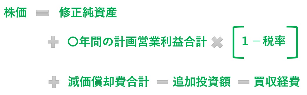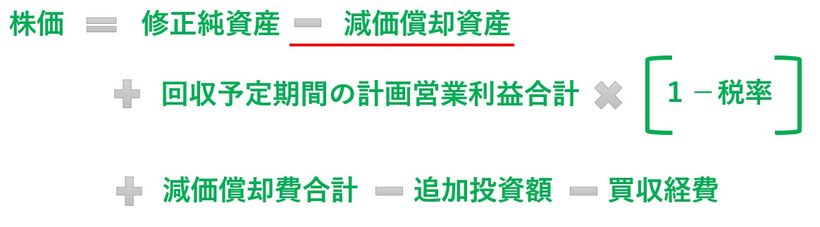 修正純資産から減価償却資産を減額します。こうすることで、換金価値が少ない固定資産を株価に反映させることなく、あくまでも買収後のキャッシュフローによる回収対象と考えることができます。