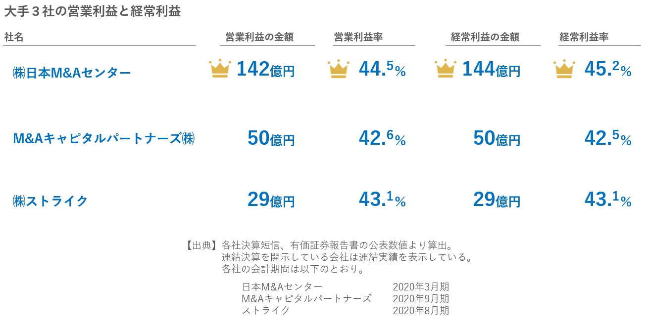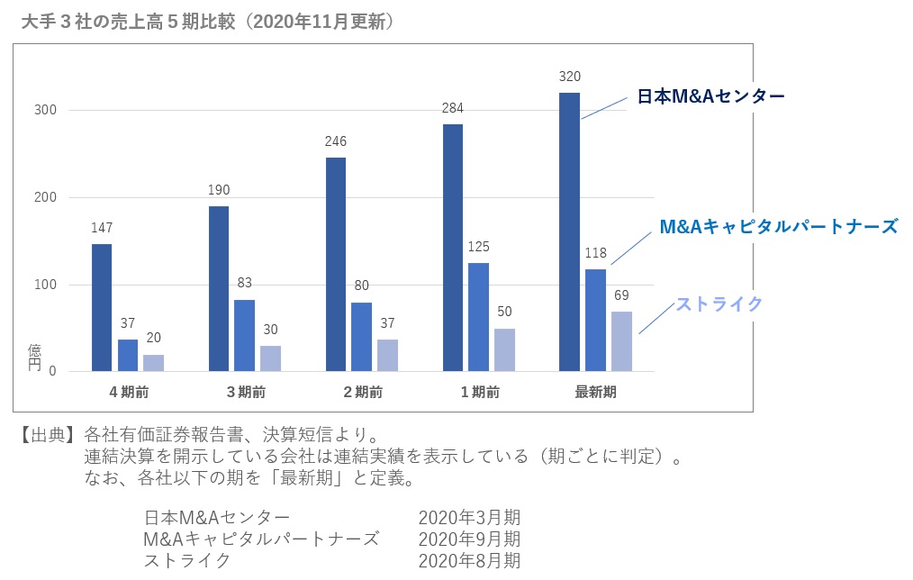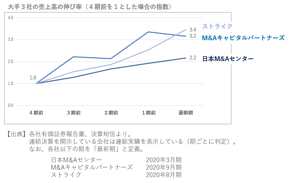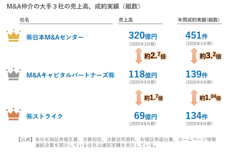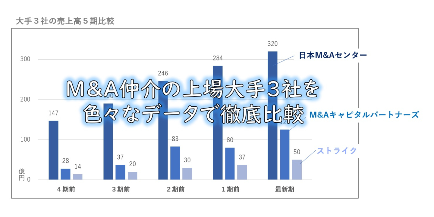 業界1位の日本M&Aセンターは、売上高ではM&Aキャピタルパートナーズの2倍以上、ストライクの3倍以上を誇ります。