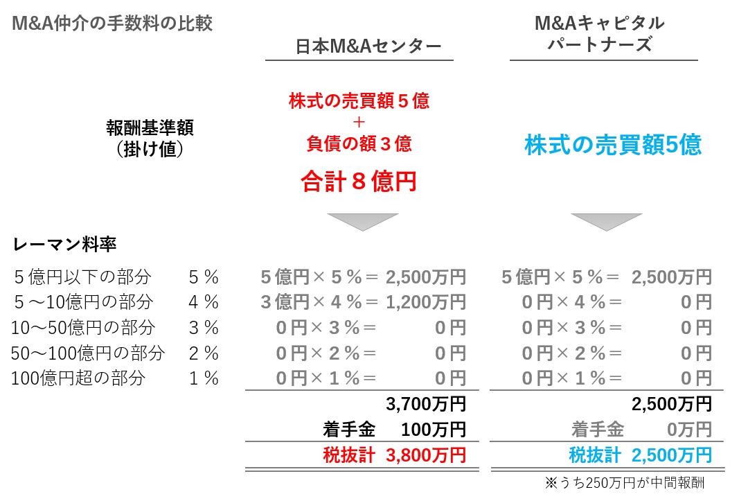 たとえば、「負債の額が3億円、純資産2億円の会社の株式が、5億円で売れた場合」で、日本M&AセンターとM&Aキャピタルパートナーズで手数料がいくら変わるかを計算してみましょう(M&Aセンターの着手金は100万円とします)。
