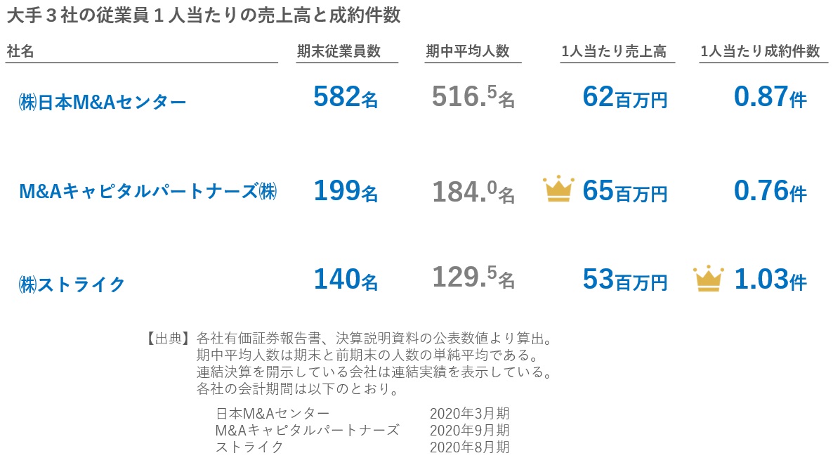 1人当たり売上高はM&Aキャピタルパートナーズ、1人当たり成約案件数はストライクが首位