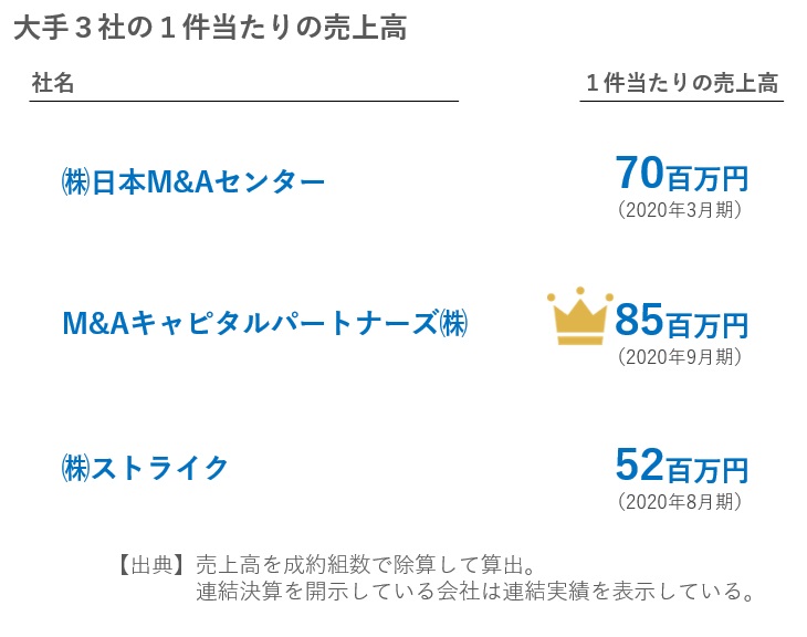 なお、売上高を年間成約件数で割り算した「1件当たりの売上高」は、M&Aキャピタルパートナーズが一番高額になっています(下図)。