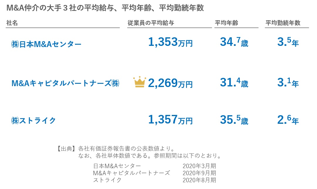 M&A仲介業は高年収で有名です。各社が公表している平均年収や平均年齢、平均勤続年数は以下のとおりです(下図)。