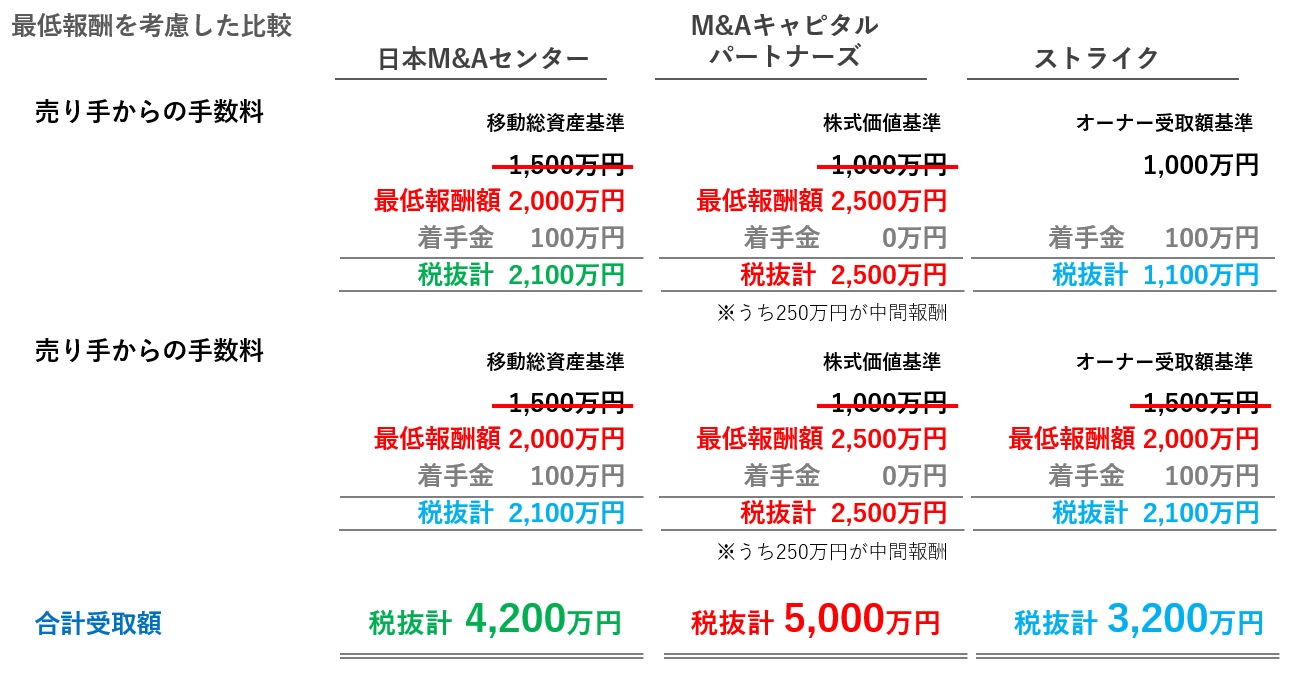 なお、基本的には3社の中ではM&Aキャピタルパートナーズが一番安いのですが、「最低報酬額」を考慮すると一番高くなることもあり得ます。