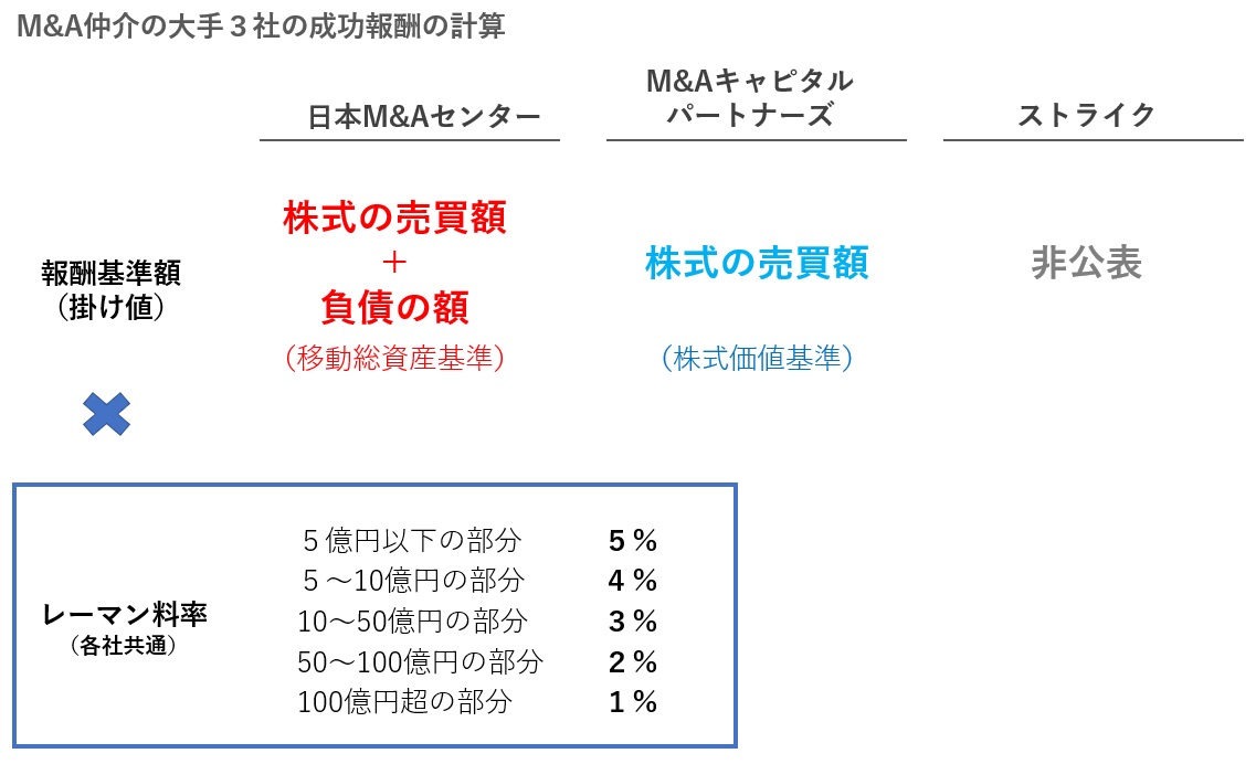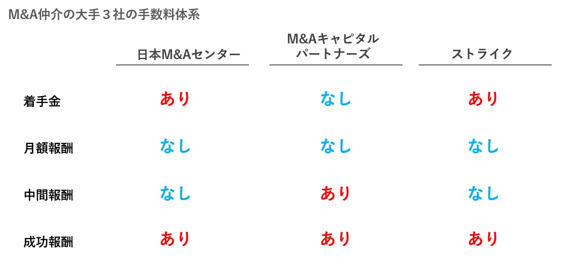 また、日本M&Aセンターはレーマン方式の成功報酬計算が「株式価値+負債」であること、M&Aキャピタルパートナーズは最低報酬額が高額であることも、大手が敬遠される大きな要因であると感じます。