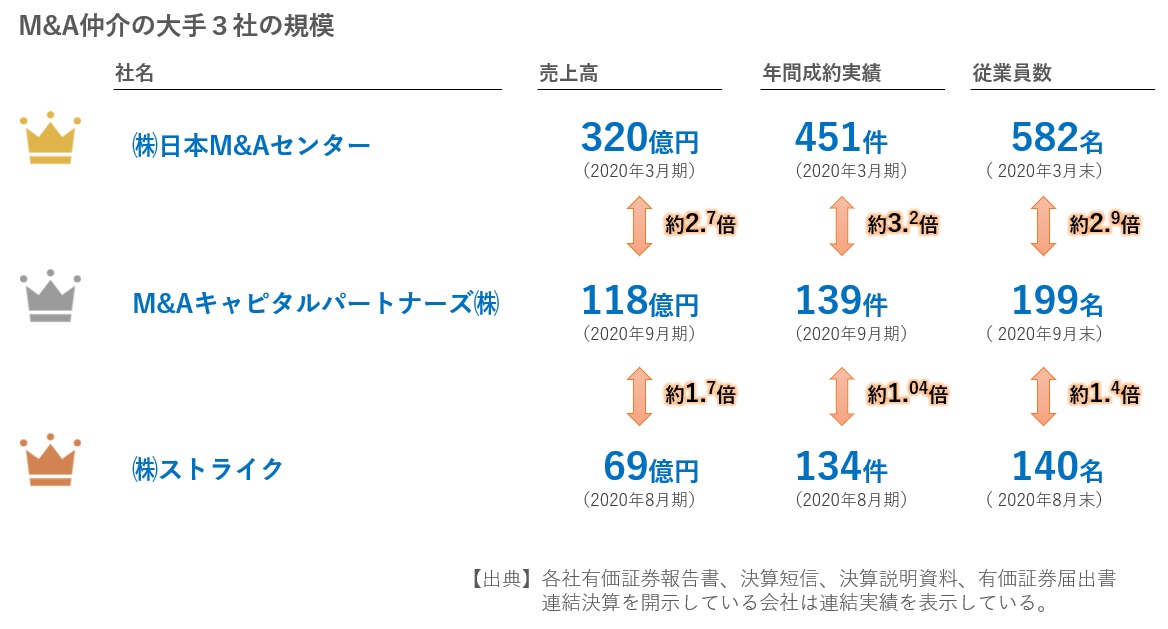 - M&A仲介の大手は日本M&Aセンター、M&Aキャピタルパートナーズ、ストライクの3社。いずれも非常に高い成長性と利益率を誇る。