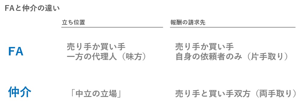 - M&A仲介は「中立の立場」であり、FAは売り手か買い手の「どちらか一方の味方(代理人)」