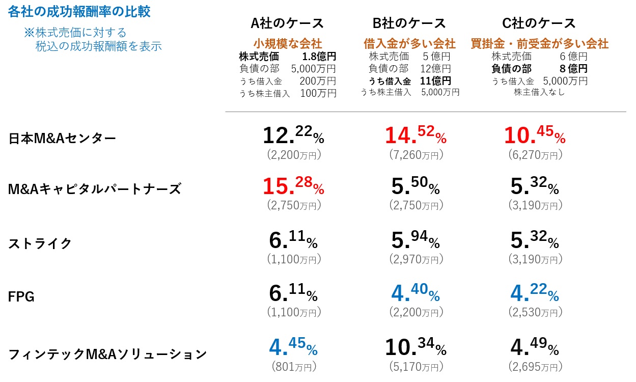 以下は上場系の5社の手数料(売り手向け)のうち、「成功報酬」の株式売買額に対する割合を計算したものです。架空のA社、B社、C社の3パターンで計算しました。