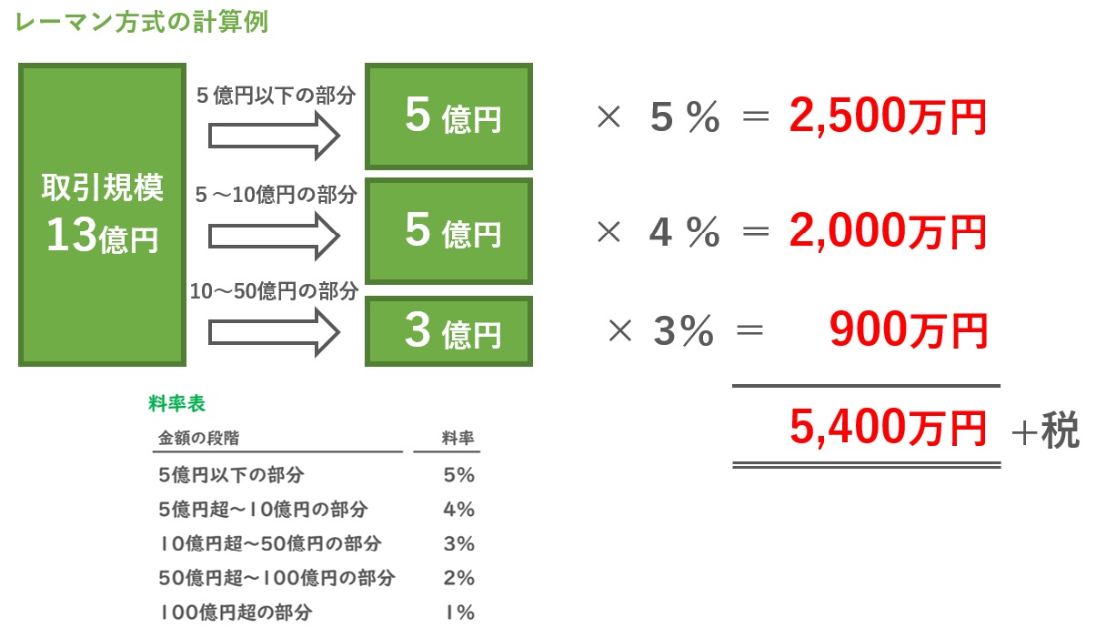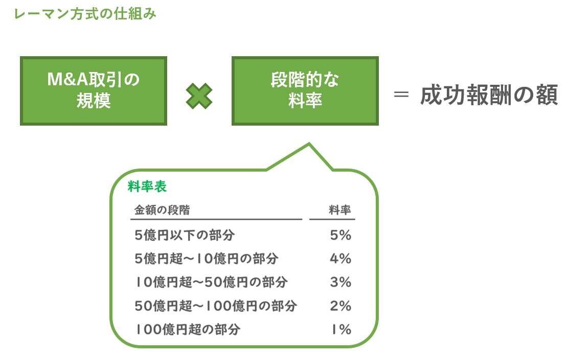 M&A仲介の手数料の大半は成功報酬なのですが、この成功報酬の計算には「レーマン方式」という特殊な計算式が使われることが多いです。これはM&A業界特有の手数料計算方法です。