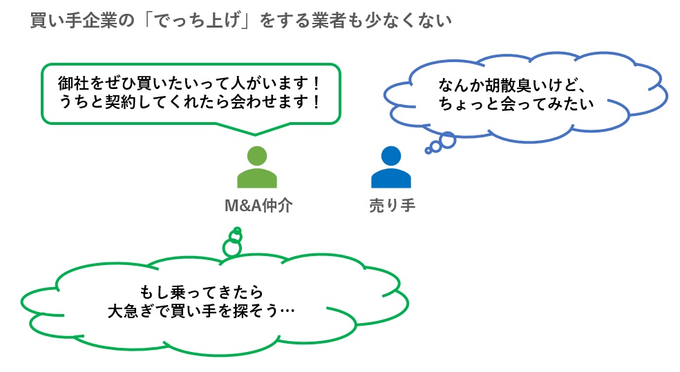 また、後述するように、実際には存在しない買収希望会社をでっち上げて売り手と契約する仲介業者も少なからず存在します(下図)。確率は高くないのですが、このような形で始まったM&Aが成立することもあり、M&Aの始まりは一様ではありません。