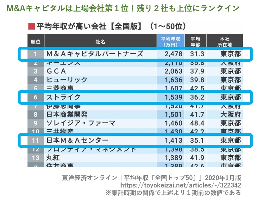 東洋経済オンライン[外部]が、毎年すべての上場企業の平均年収を集計してランキングを公表しているのですが、M&A仲介の大手3社は毎回上位にランクインしています(下図)。