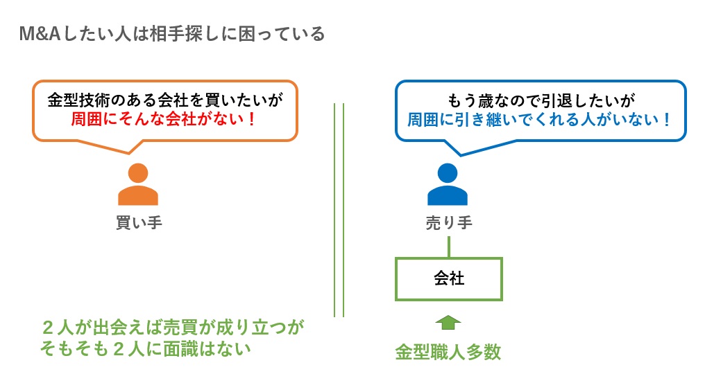 会社を売りたいという人と、会社を買いたいという人は常にそれなりにいるのですが、問題は「どうやって売り手と買い手が出会うか」です。売買希望者は、常に相手探しに困っています(下図)。