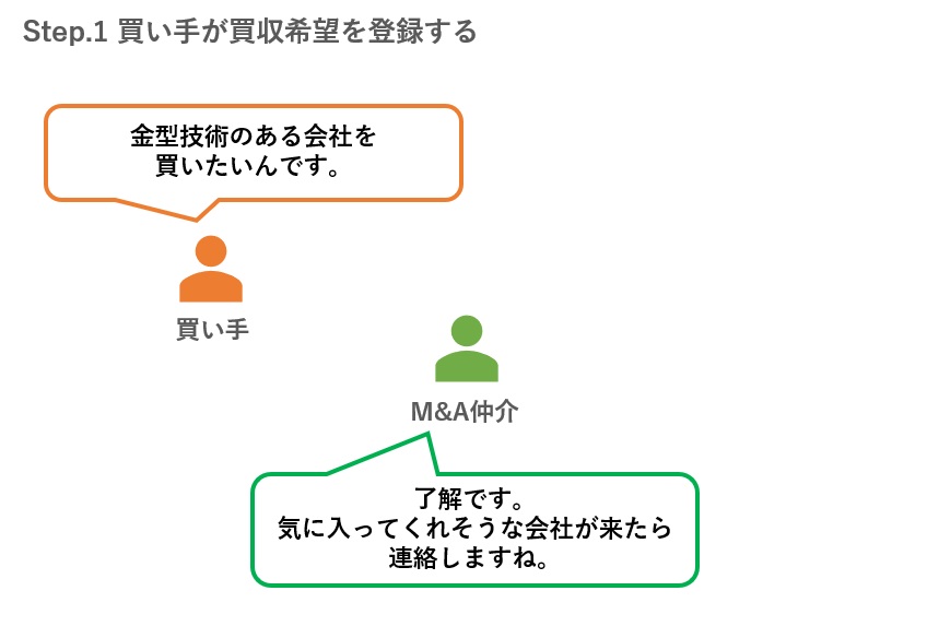 わかりやすいマッチングの流れとしては、まず買い手が仲介会社に、「こんな会社を買収したい!」とい買収希望を伝えておきます(下図)。
