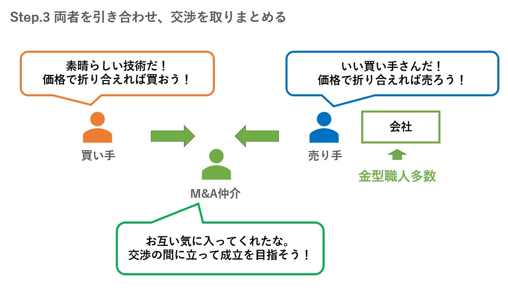 うまくニーズが合いそうであれば、仲介会社は両者を引き合わせ、売買交渉を仕切りながらM&Aが「成立」するように段取りを整えていきます(下図)。