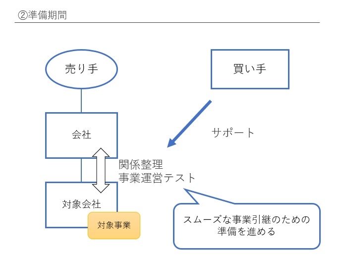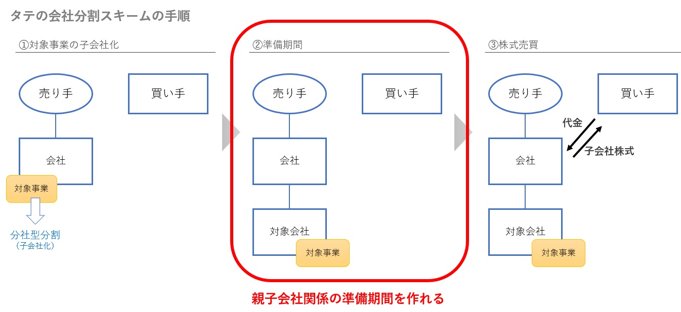 その点、タテの会社分割によって一旦売り手グループの子会社にすることで、急激な変化を相当和らげる効果があります。子会社期間は1~2カ月程度取り、その間は買い手企業と協力しながら「嫁入り」の準備を進めるといった流れです(下図)。