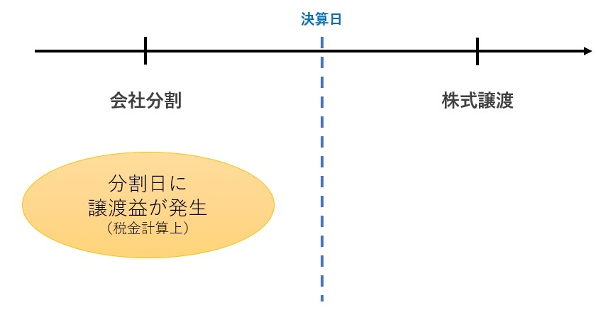 これに対し、タテの会社分割では、会社分割を実行した日の属する事業年度に法人税が発生します(下図)。したがって、会社分割から株式譲渡の間に決算日を迎えた場合、M&A対価を受け取る前に納税しなければならないということも起こり得ます。