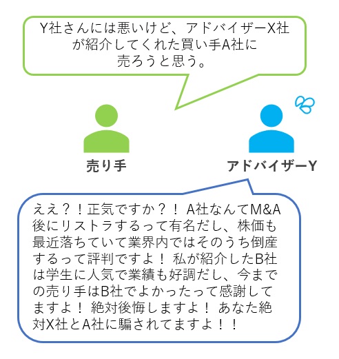 多くのM&Aアドバイザーは、何が何でも売り手を翻意させるべく、必死で自社候補の売り込みを図るでしょう。恐らく、誇張や嘘も交えながら(下図)。