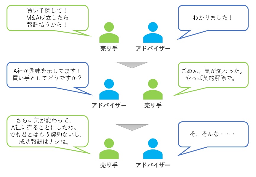 仮に、M&Aアドバイザーがしっかりコストをかけて買い手候補を見つけてきてくれたとしましょう。しかし、残念ながら売り手の意に沿わなかったとします。売り手が「悪いけど他のアドバイザーが連れてきた相手に売るよ」と言ったとき、「ああそうですか」と引き下がるでしょうか?