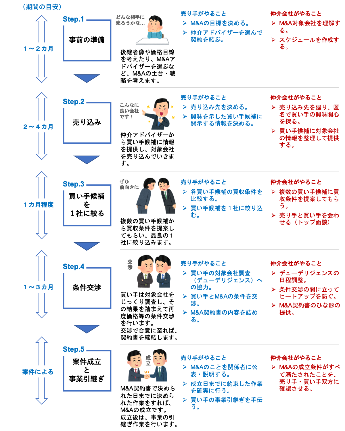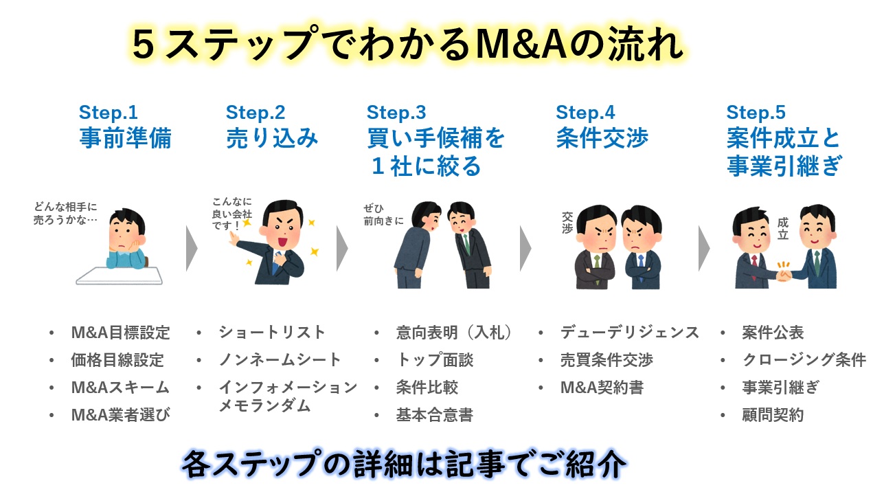 - より直感的にイメージできるM&Aの流れ5ステップ一覧