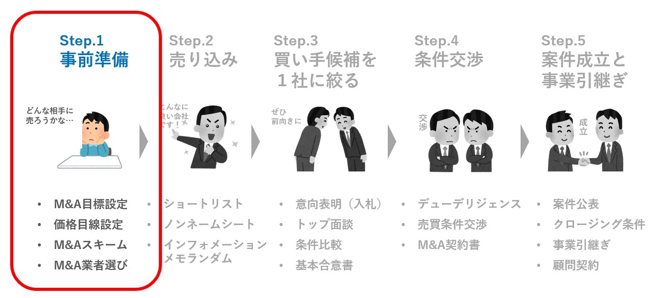 まずは事前準備をしっかり行いましょう。段取り八部という言葉がありますが、M&Aにおいても事前準備は非常に重要です。