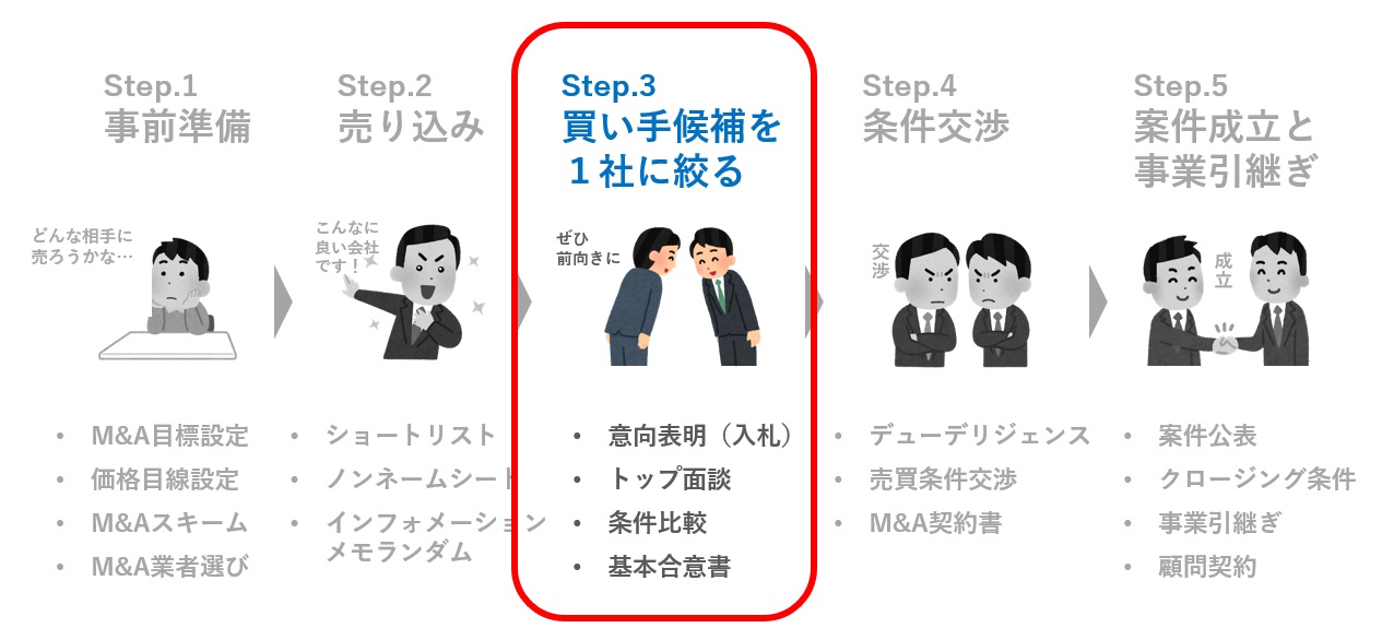 意向表明書で価格やM&A後の事業運営を訊き出し、またトップ面談で人柄などを確認したら、それを比較して買い手候補を1社に絞り込みましょう。