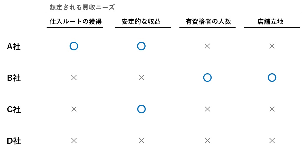 M&A業者からの情報も踏まえて、それぞれの候補に対して、「前ステップで挙げた買収ニーズを持っているとしたら、どれになるか?」を考えていきます。