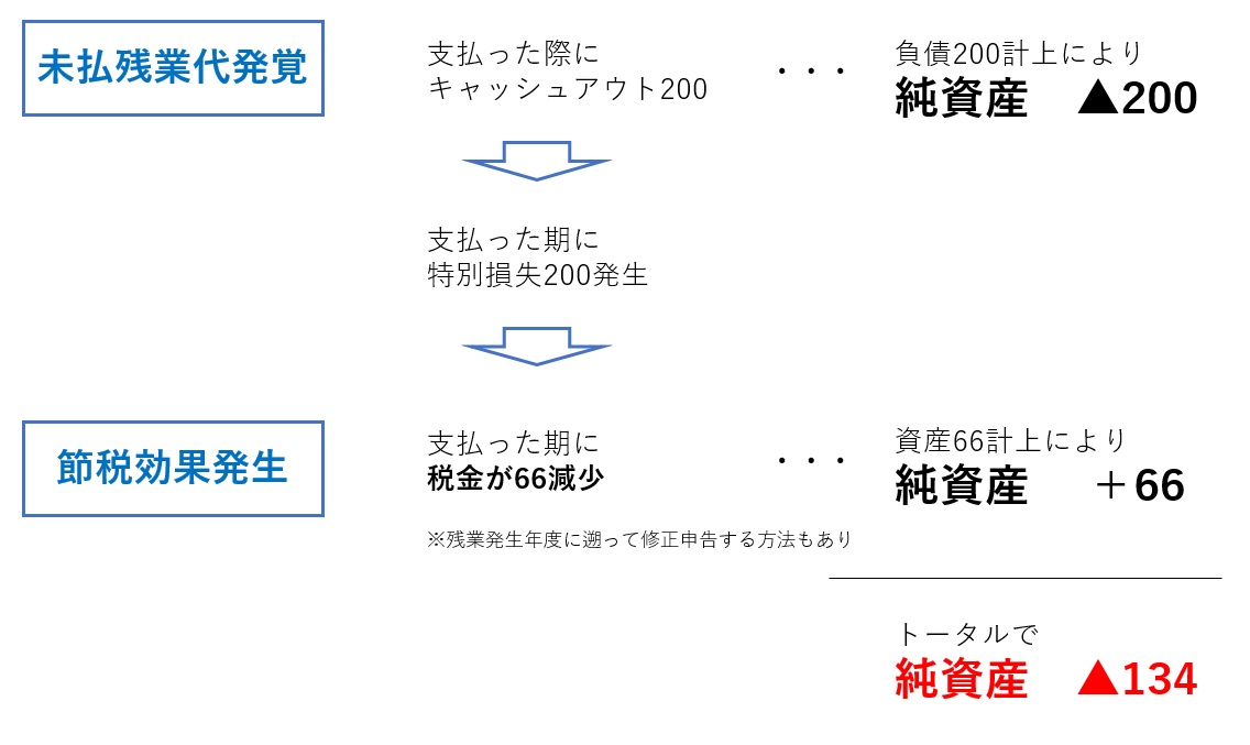 これを負債として計上するのは当然なのですが、実際にはこの200万円の残業代を支払ったとき、その支出は200万円の損金ということになります。つまり利益が200万円減少し、税率を33%とすると、66万円の税負担軽減が発生することになります。