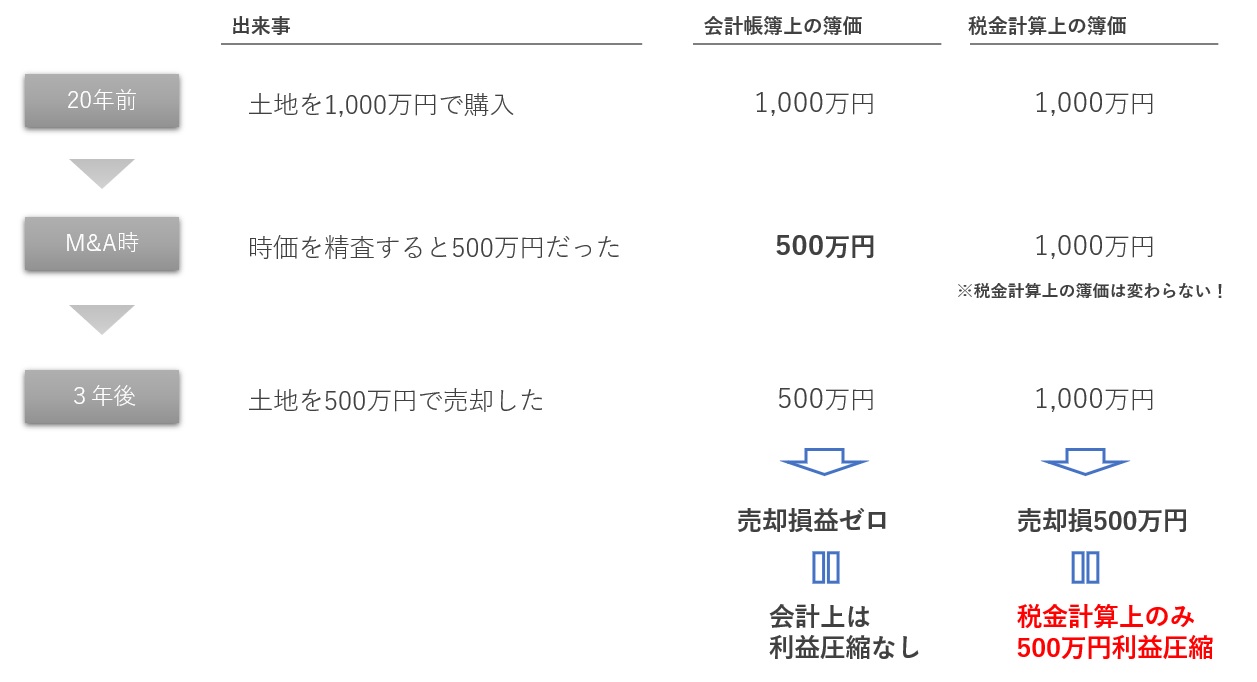 さてM&Aの3年後、当該土地を500万円で売却するとどうなるでしょうか。会計上は土地の簿価が500万円なので、500万円で売れば売却損益はゼロです。一方で、税金計算上は簿価が1,000万円なので、収入500-簿価1,000万円=▲500万円と、500万円の売却損失が生じます。