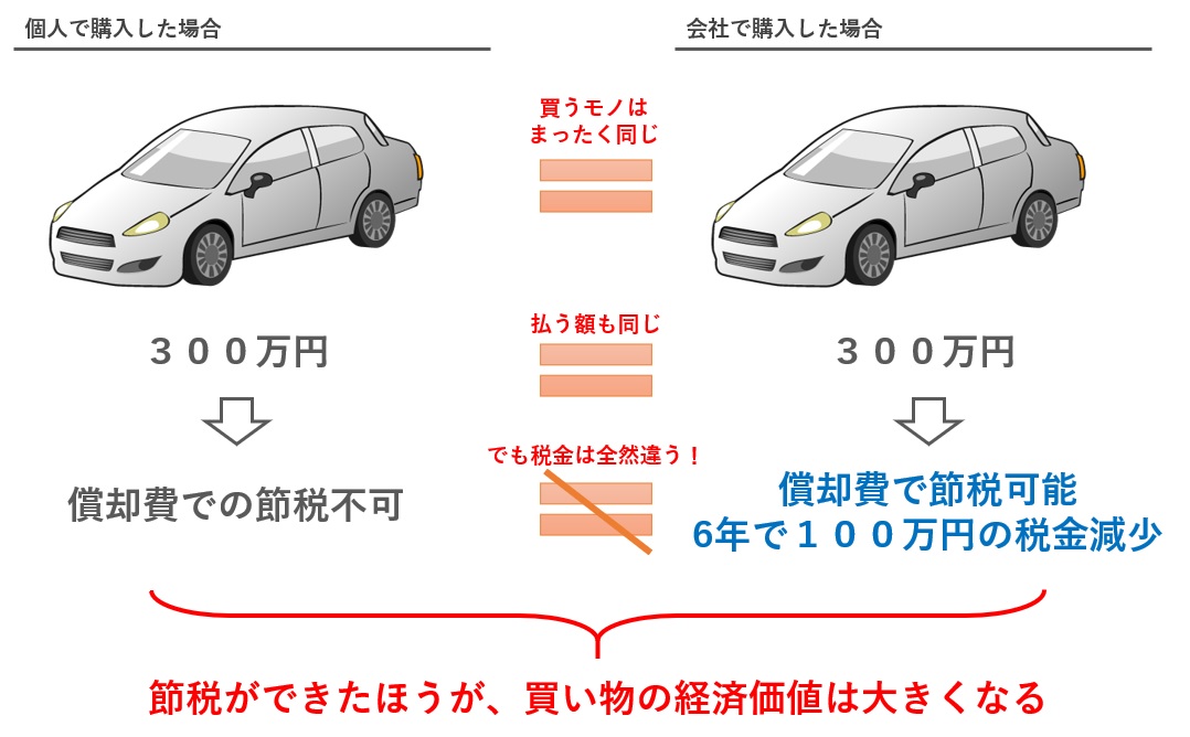 つまり、節税効果が生まれない場合よりも、生まれる場合のほうが、全体の経済価値は大きくなります。ただし、この場合は同じ車ですので、節税効果の有無で車の評価額が変わるわけではありません。「300万円の車と100万円の税負担減少効果を手に入れた」ということになります。