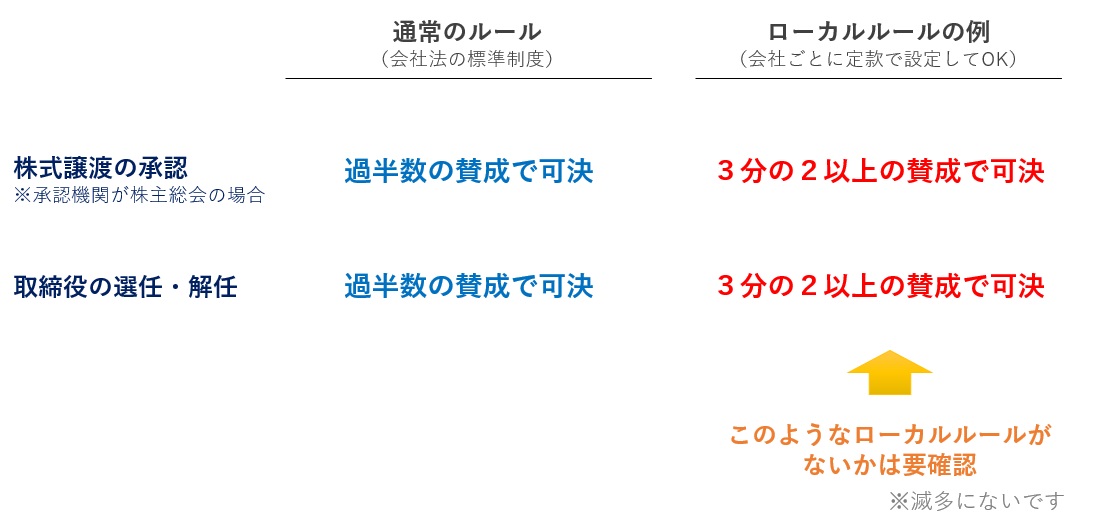 しかし、定款で「株式譲渡承認は3分の2の賛成が必要」とか「取締役の解任は3分の2の賛成が必要」などのローカルルール(要件加重)を定めることは可能ですので、このような「特別な規定」が存在しないかどうかは確認しておきましょう(下図)。