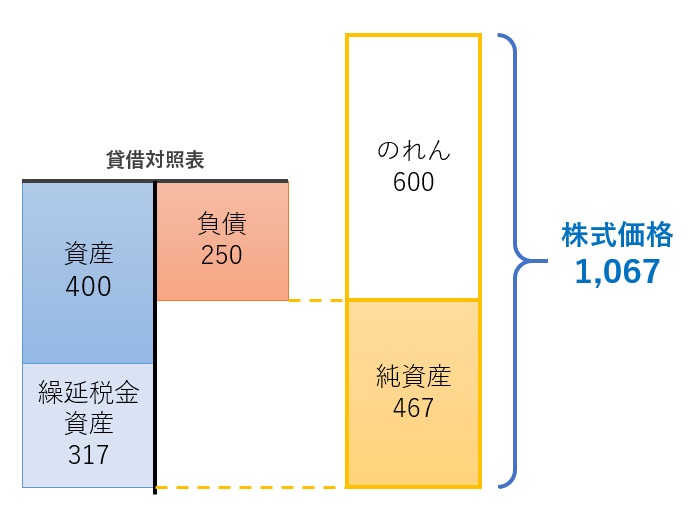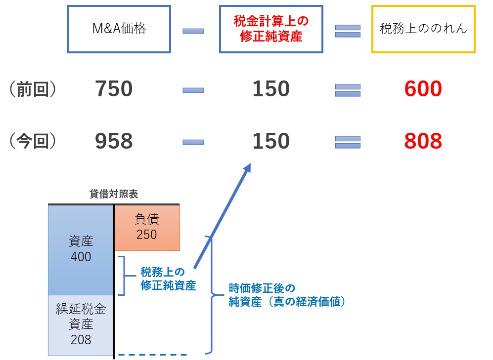 つまり、税務上ののれんの算定では、繰延税金資産は無視して計算します。このことが、M&A価格を跳ね上げる秘密になっています。