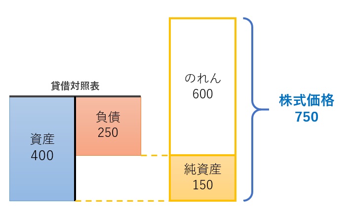 A社は事前調査の結果、純資産が150百万円に対し、のれん600百万円、株式価格750百万円が見込まれていました。今回はこのA社を例に説明しましょう。
