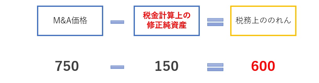 まず、純資産150百万円(繰延税金資産を考慮前)のA社に750百万円のM&A価格が付いたときの、税務上ののれん額はいくらでしょうか。