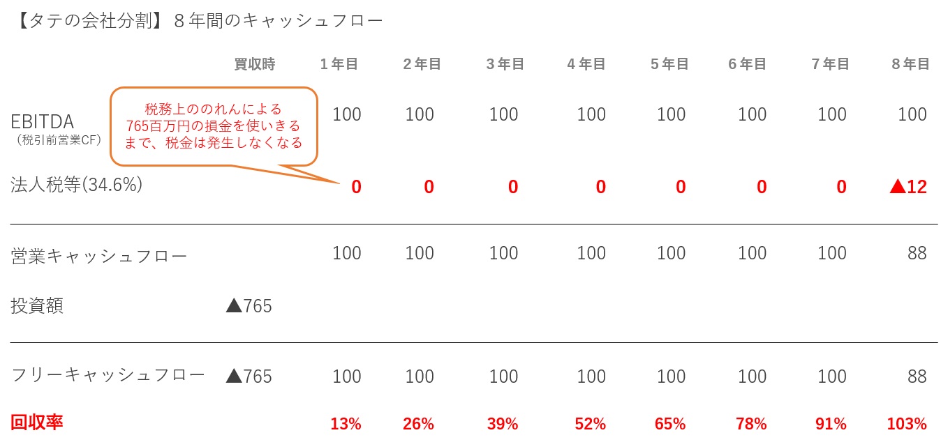 なお、この会社(事業)をタテの会社分割で買収した場合、単純な株式譲渡と同じ負担感になるのは、765百万円(1.53倍!)です。