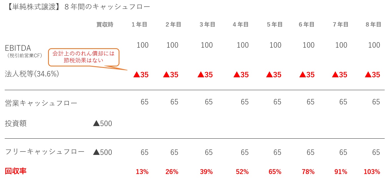 まず、単純な株式譲渡で500百万円出した場合のキャッシュフローは下図のとおりです。概ね8年弱での回収となります。