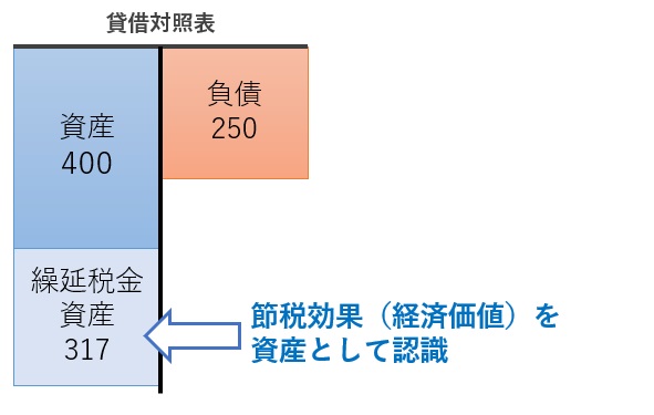 具体的に貸借対照表で確認すると、本件で発生するのれんの節税効果は317百万円(東京都中小企業の超過税率34.6%を使用)でしたので、この金額を繰延税金資産として資産の部に計上します(下図)。