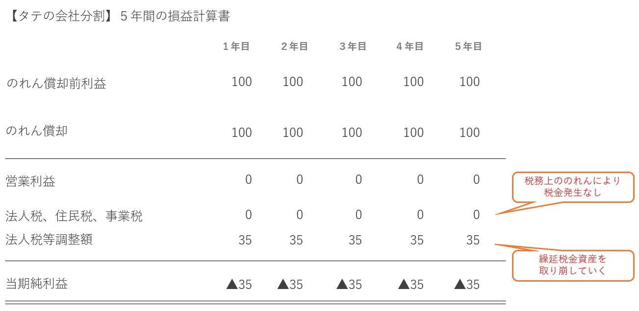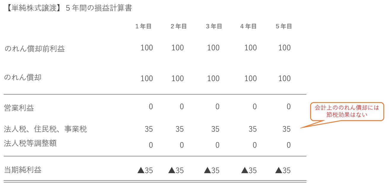 上図のとおり、税金(法人税、住民税、事業税)はのれんの節税効果によりゼロになりますが、繰延税金資産の取り崩し(法人税等調整額)が行われるため、当期純利益は同額になります。