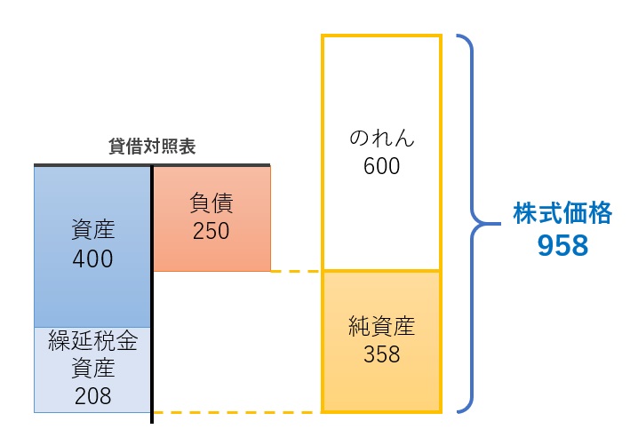 上記の節税効果208百万円には間違いなく経済価値がありますので、繰延税金資産を208百万円計上します。すると、純資産(繰延税金資産を反映した真の経済価値)は358百万円になり、これにのれん600百万円が乗ると、M&A価格は958百万円になります(下図)。