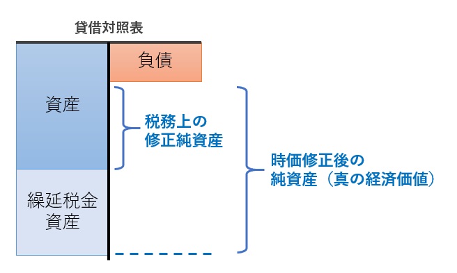 このときの「税金計算上の修正純資産」では、税務ルールの範囲内で認められた財産しか時価評価しません。実は繰延税金資産は税務ルール外のもの(無視しないと税金計算ができなくなるため)なので、いくら経済価値があっても、税金計算上の時価純資産には反映されません(下図)。