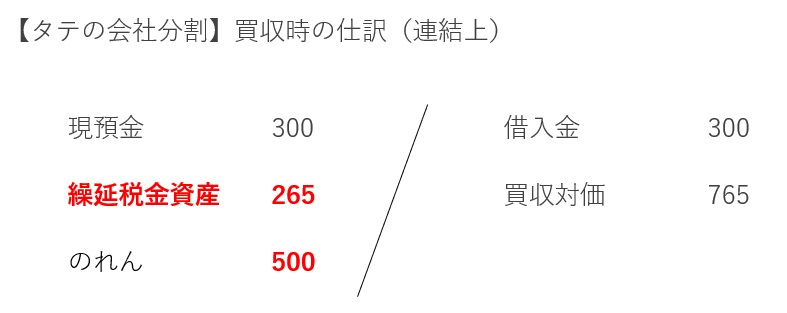 これに対し、タテの会社分割を使って765百万円で買収した場合、連結上の買収仕訳は以下のとおりとなります。